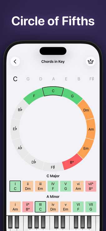 В дополнение к основной функции приложение предоставляет инструменты для изучения ключевых подписей и отношений аккордов. Пользователи могут выбрать любой ключ из интерактивной диаграммы, чтобы просмотреть его мажорные и минорные гаммы, в то время как функция 'Аккорды в ключе' позволяет без усилий исследовать аккорды, связанные с каждым ключом. Приложение также включает функцию 'Формы аккордов', которая визуально отображает формы аккордов на виртуальной клавиатуре, что делает его подходящим для музыкантов всех уровней.